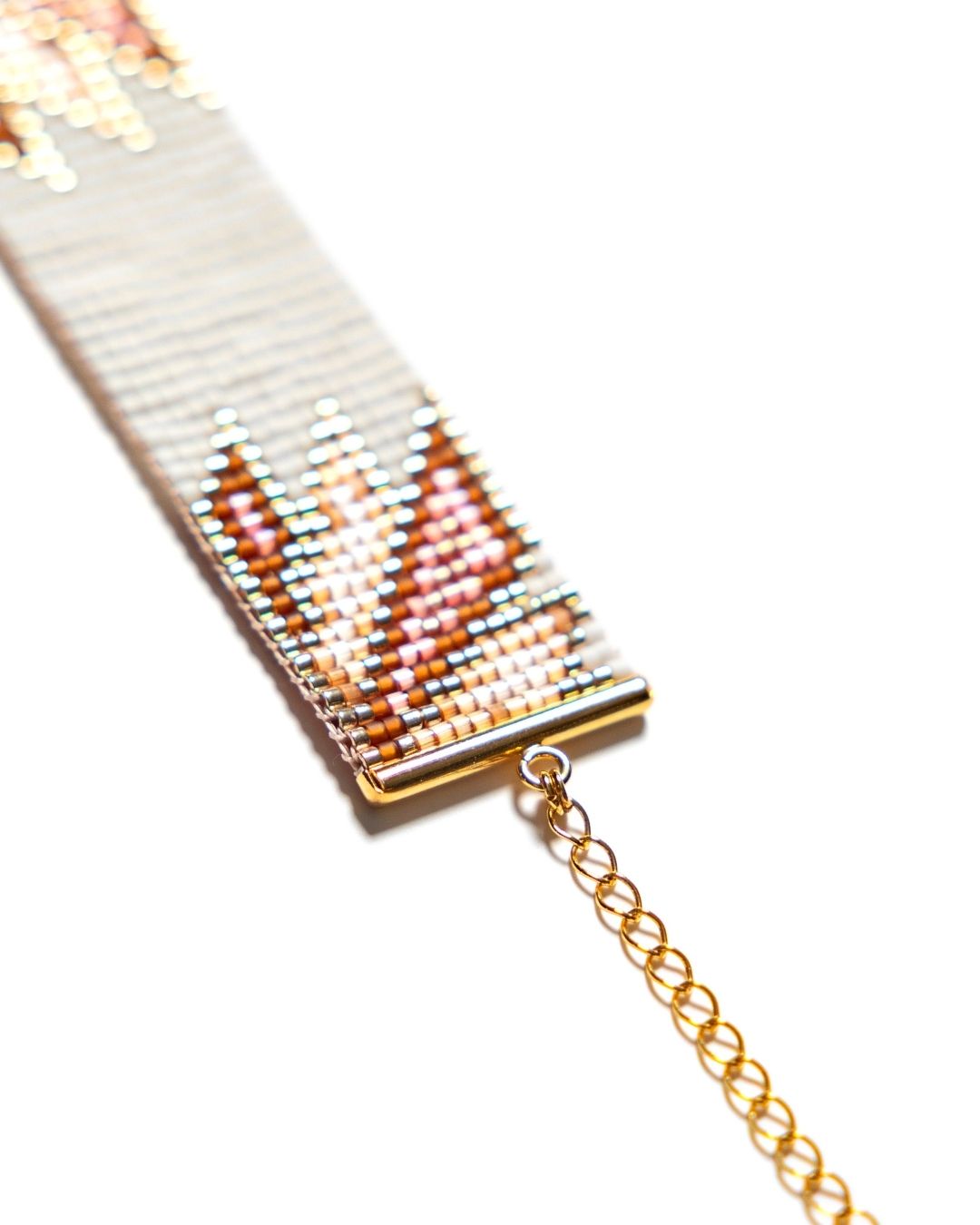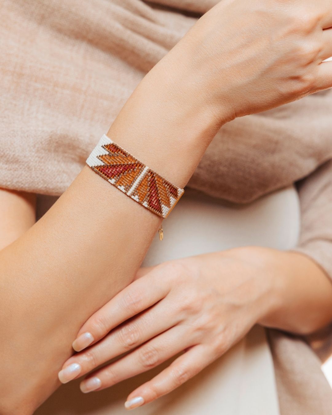Handwoven at 2 cm width, the bracelet features an adjustable chain (14–19 cm) and 14k gold-plated details, perfect for both casual and refined styles.