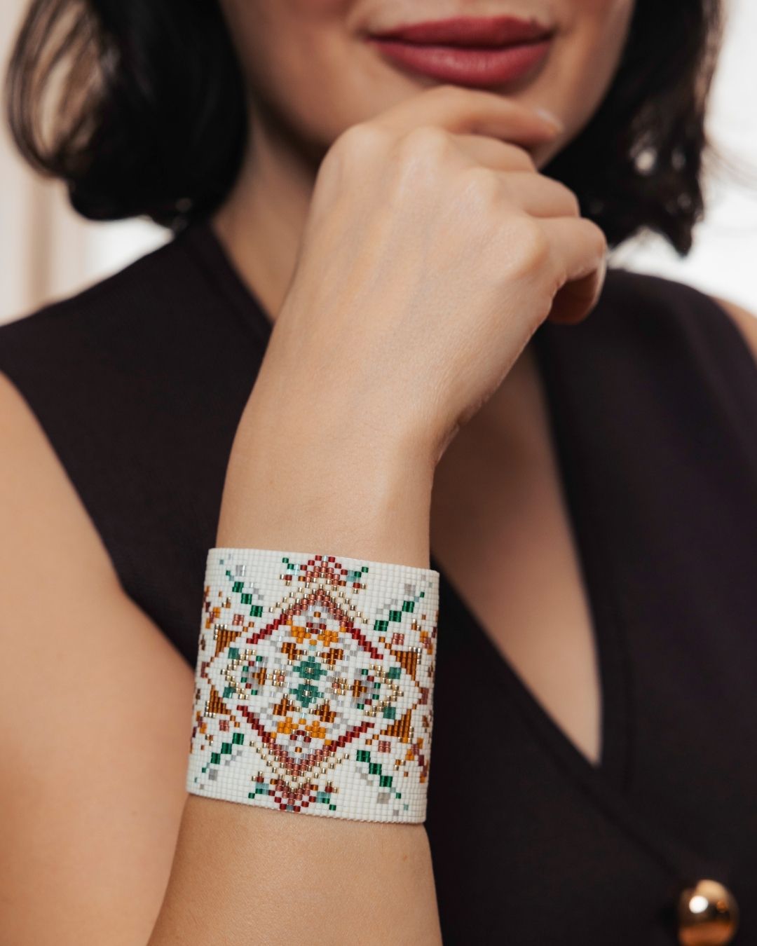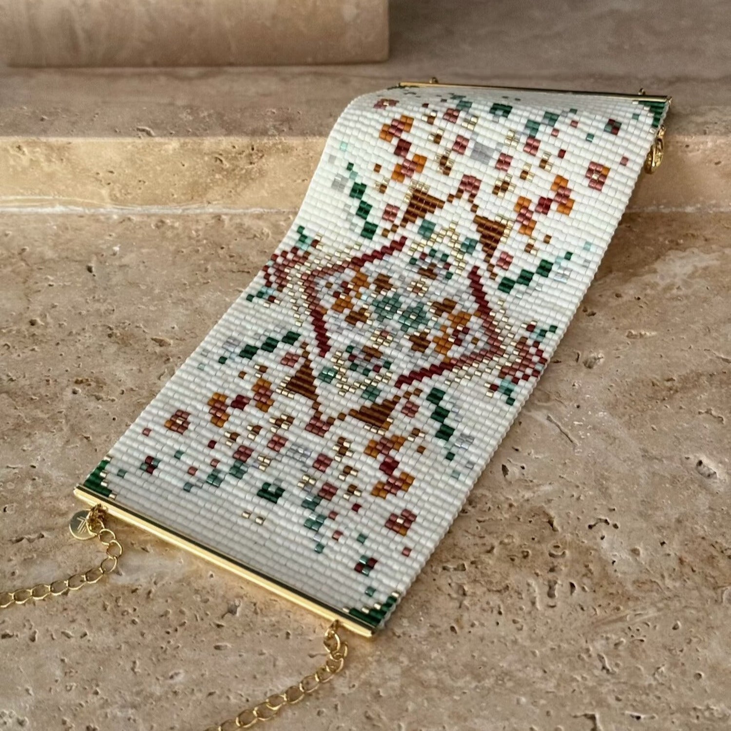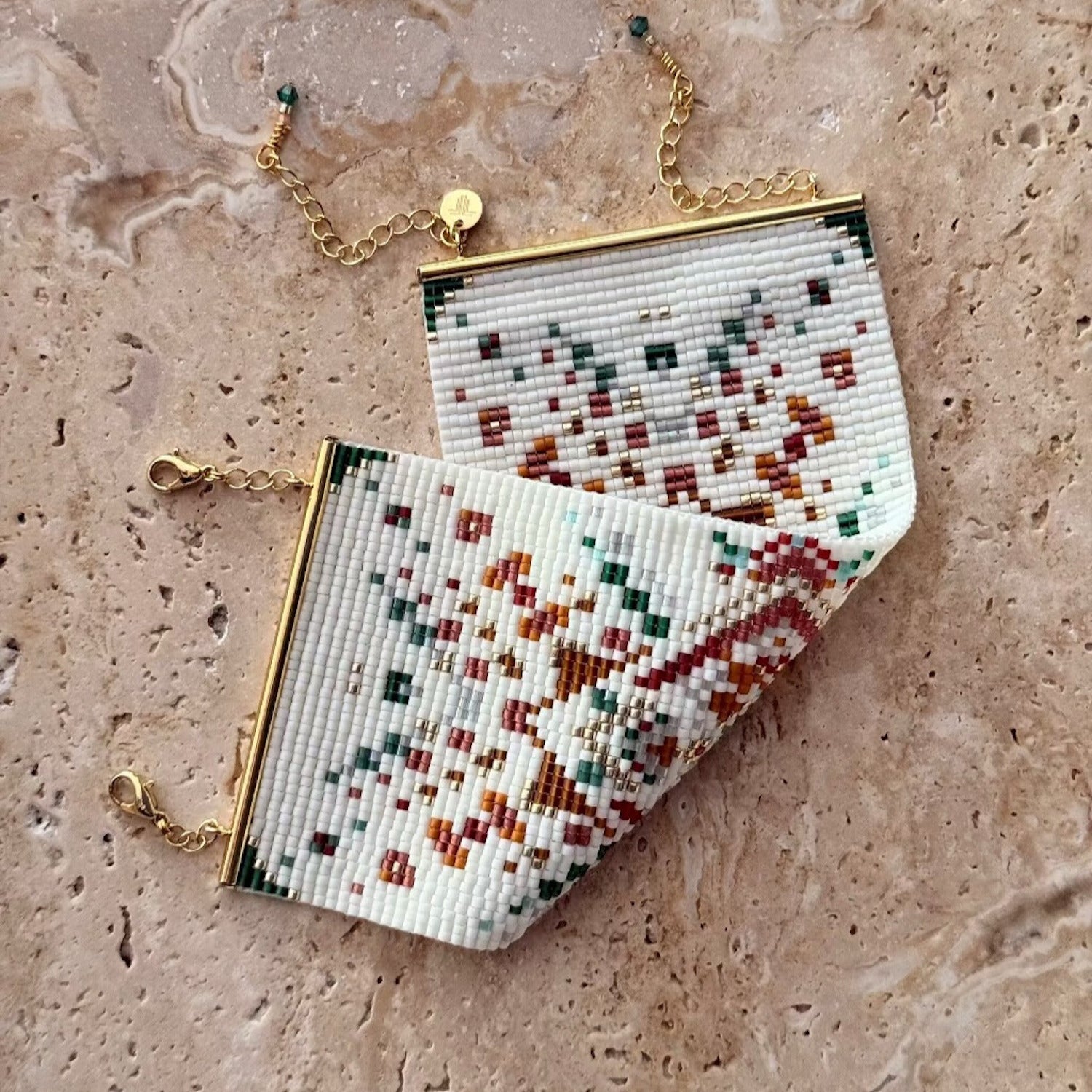 Fransız tasarımcı Marion Mazô’nun özgün deseni, lisanslı iş birliği ile Touchary’nin el emeğinde hayat buldu. 6 cm genişliğinde işlenen bu özel Miyuki bileklik, detaylardaki incelik ve sanatsal çizgisiyle her anınıza eşlik edecek.