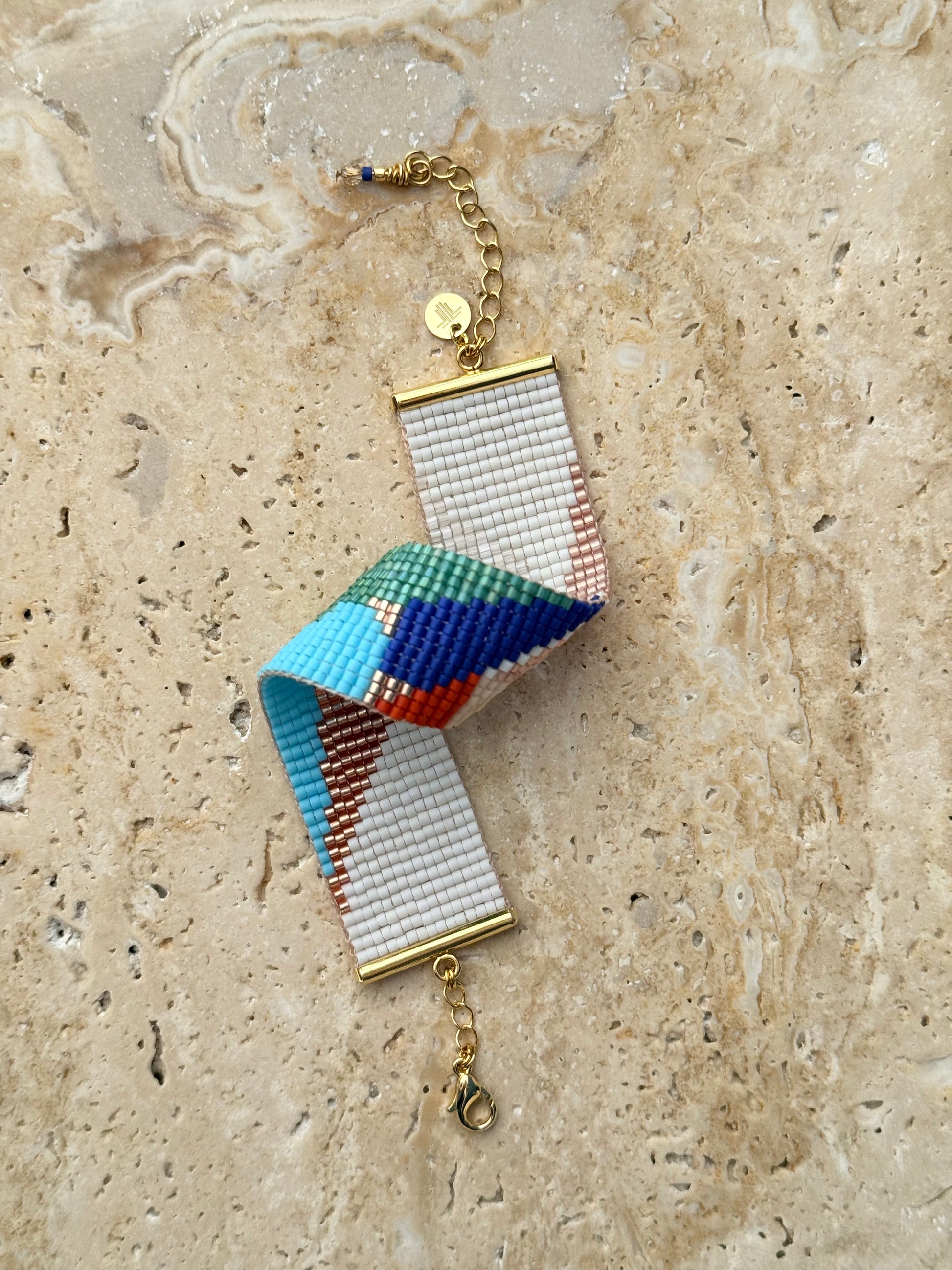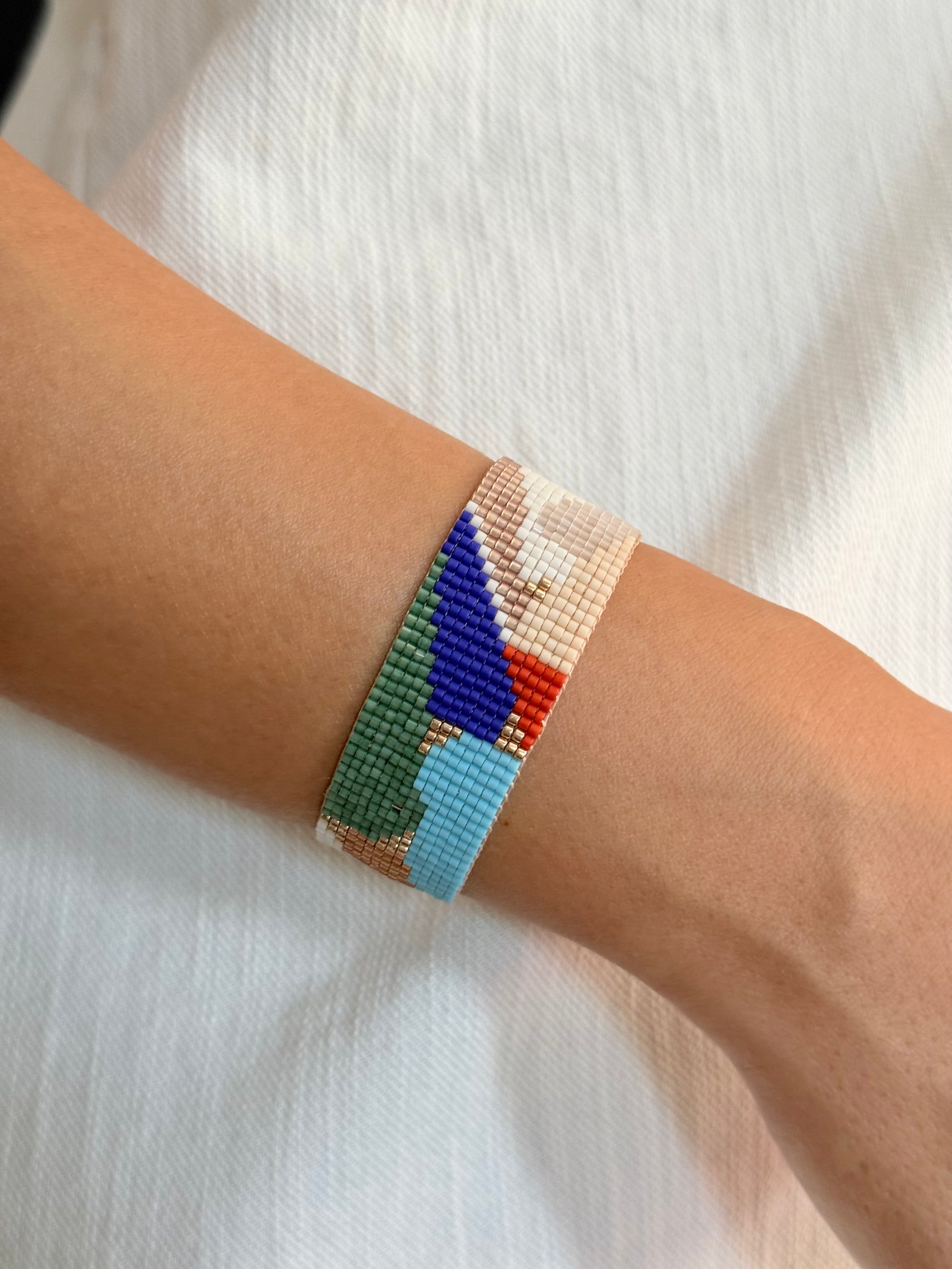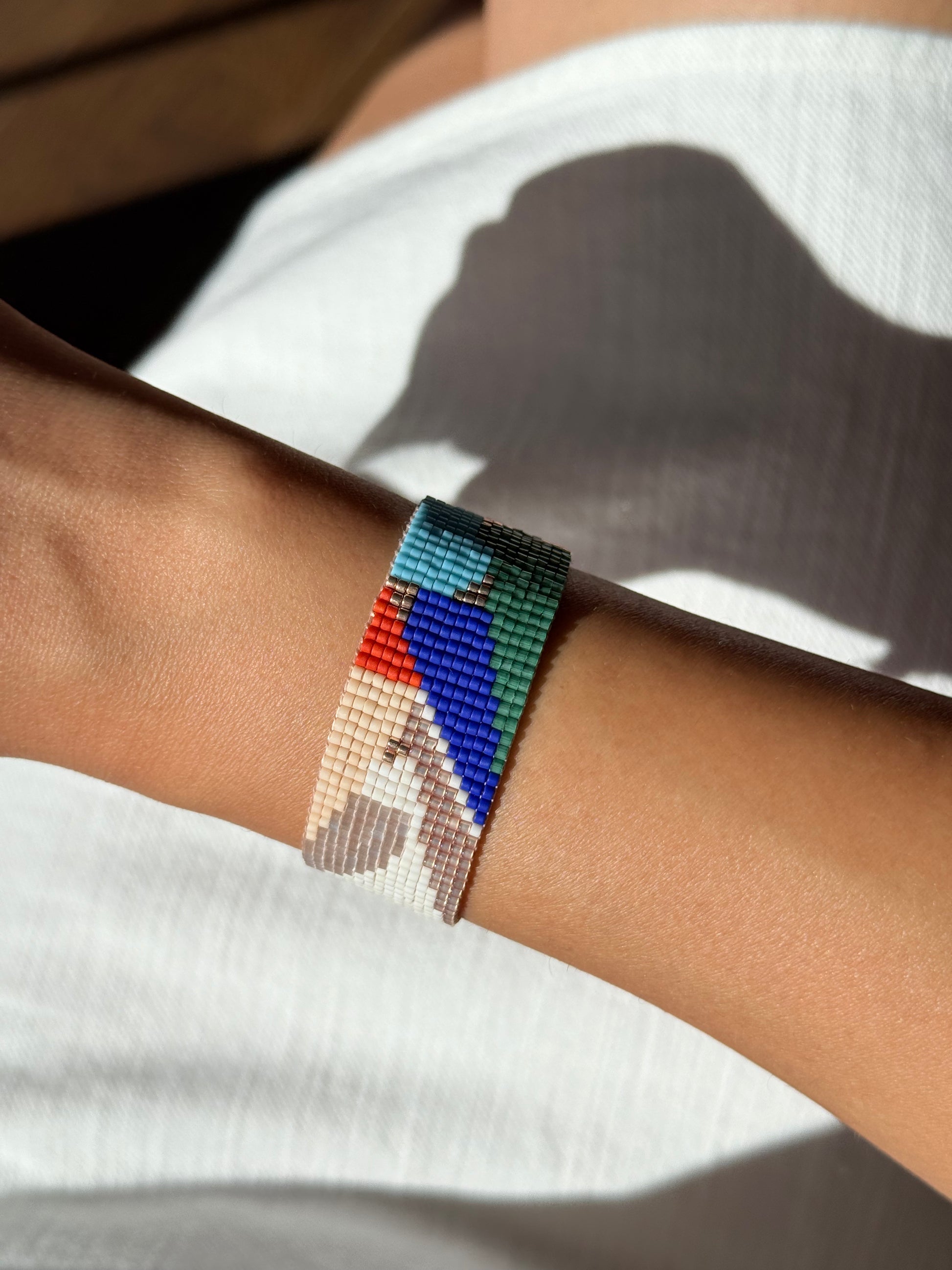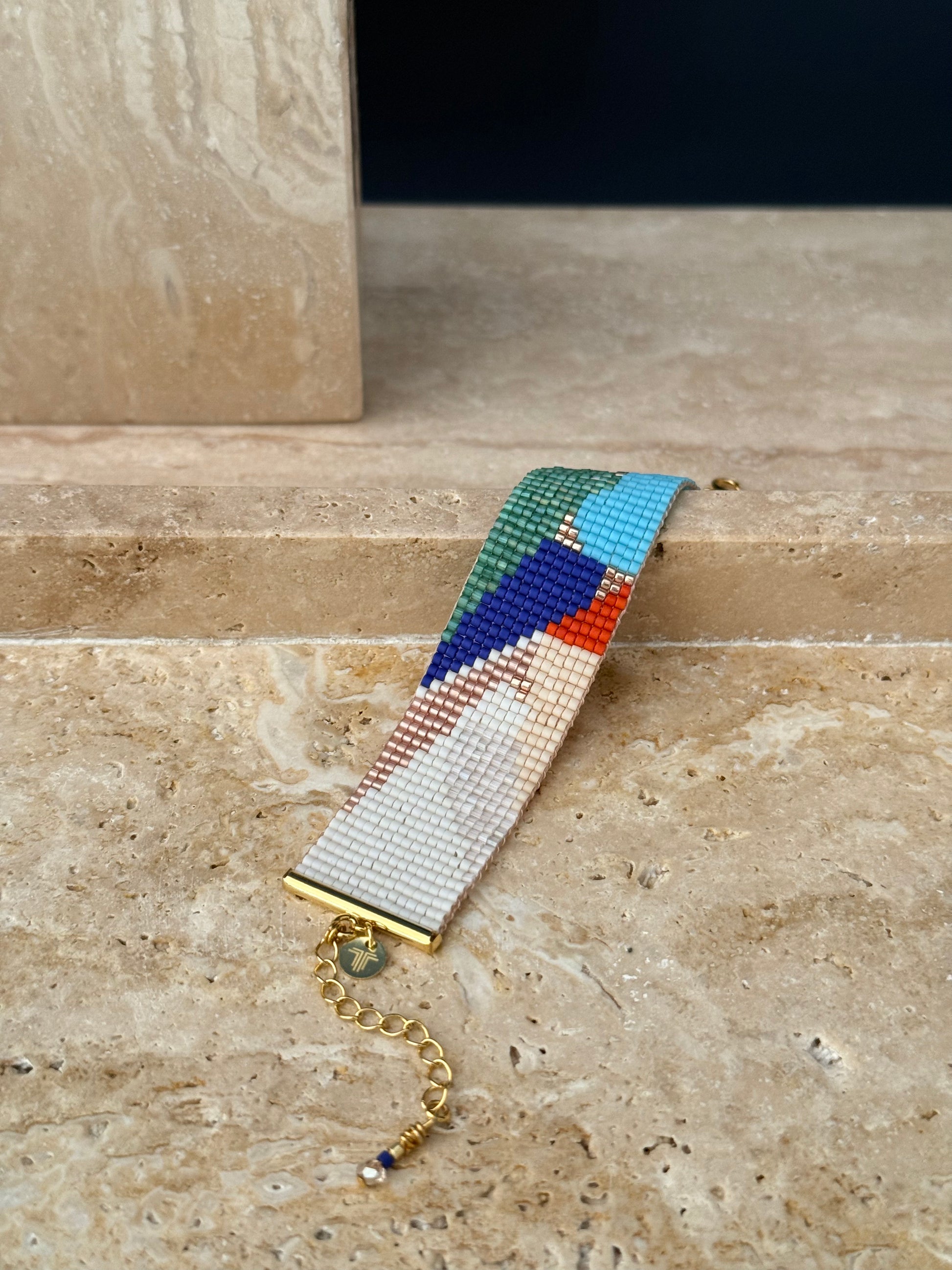 Soyut çizgiler ve ritmik renk geçişleri, Touchary’nin el emeğiyle zarif bir bilekliğe dönüştü.