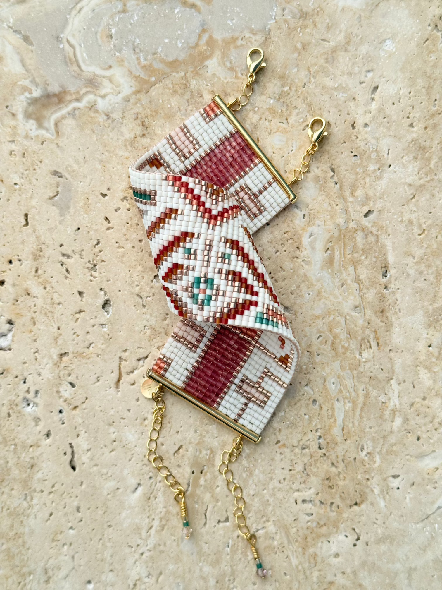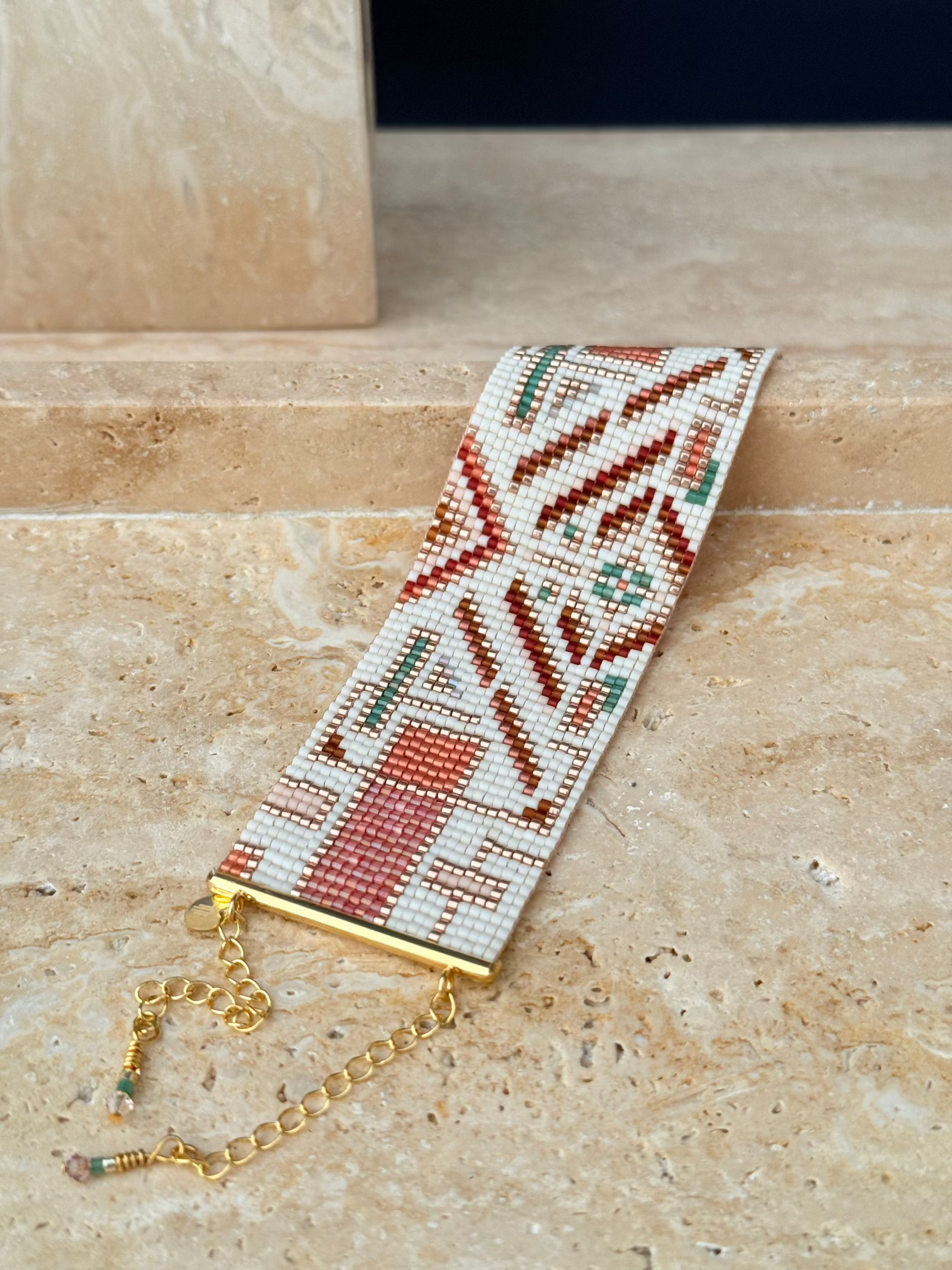 3.5 cm genişliğinde işlenen desen, 14 cm – 19 cm arasında ayarlanabilen zinciri ve 14k altın kaplama metal parçaları ile hem günlük kullanımda hem de özel davetlerde fark yaratmak isteyenler için ideal.