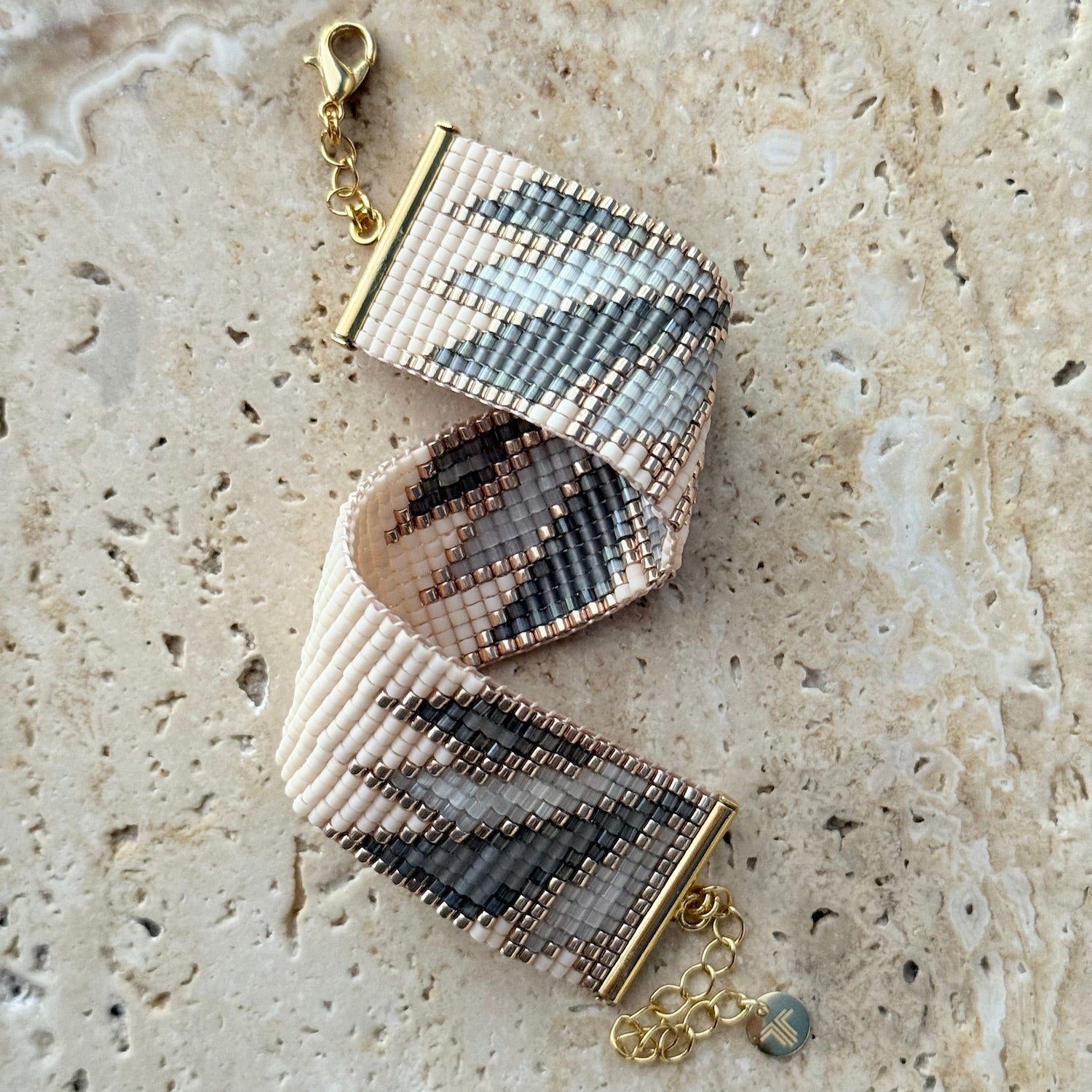 2 cm genişliğinde el dokuması bu bileklik, 14–19 cm arasında ayarlanabilir zinciri ve 14k altın kaplama detaylarıyla, her stile zarif bir tamamlayıcı olarak tasarlandı.