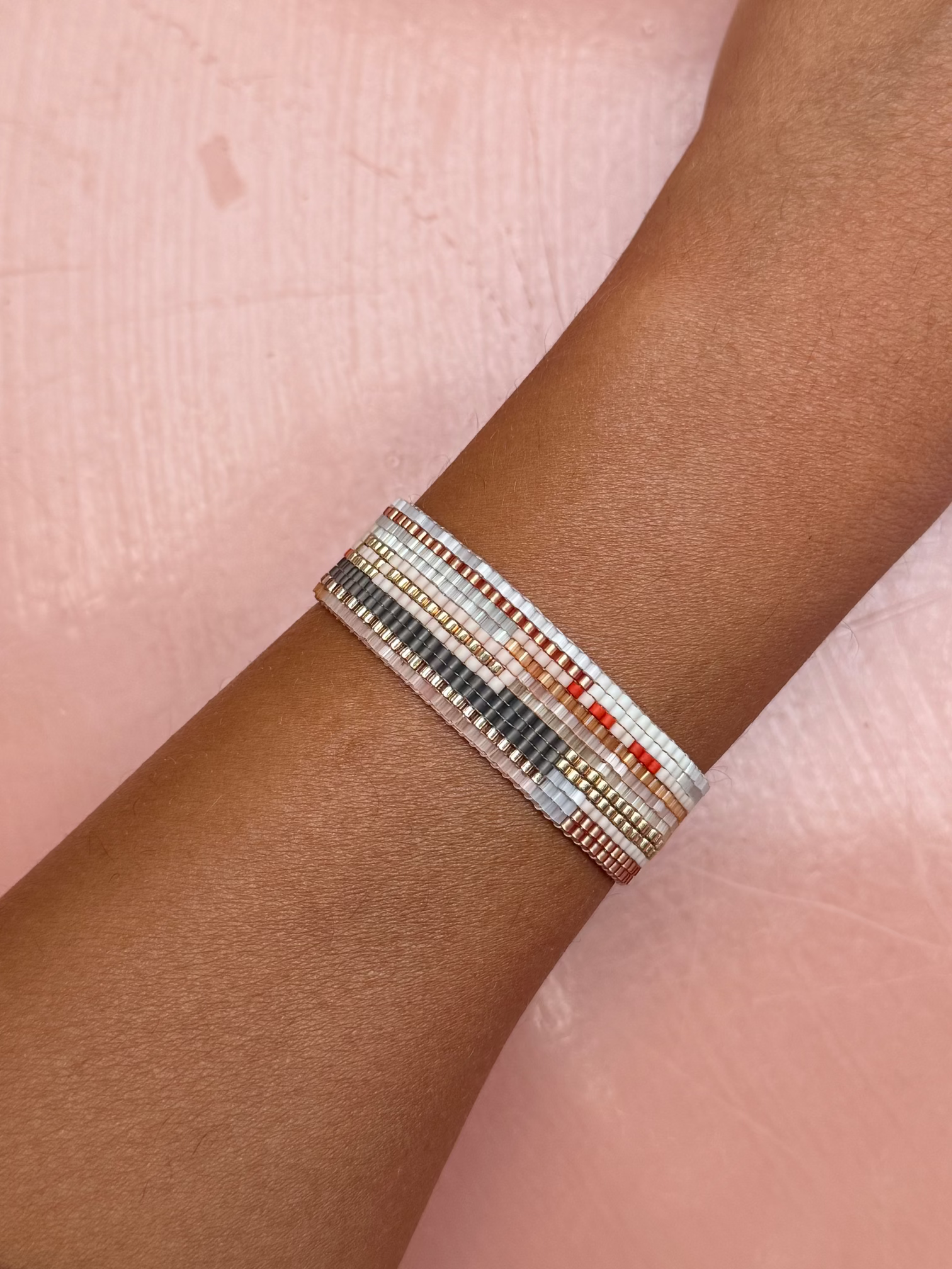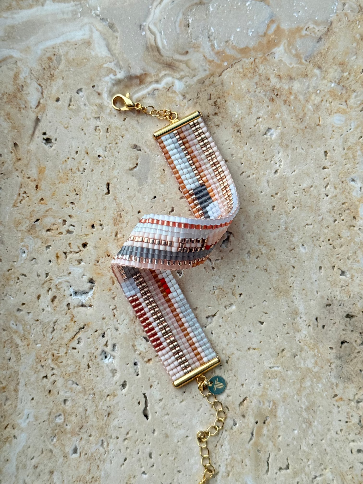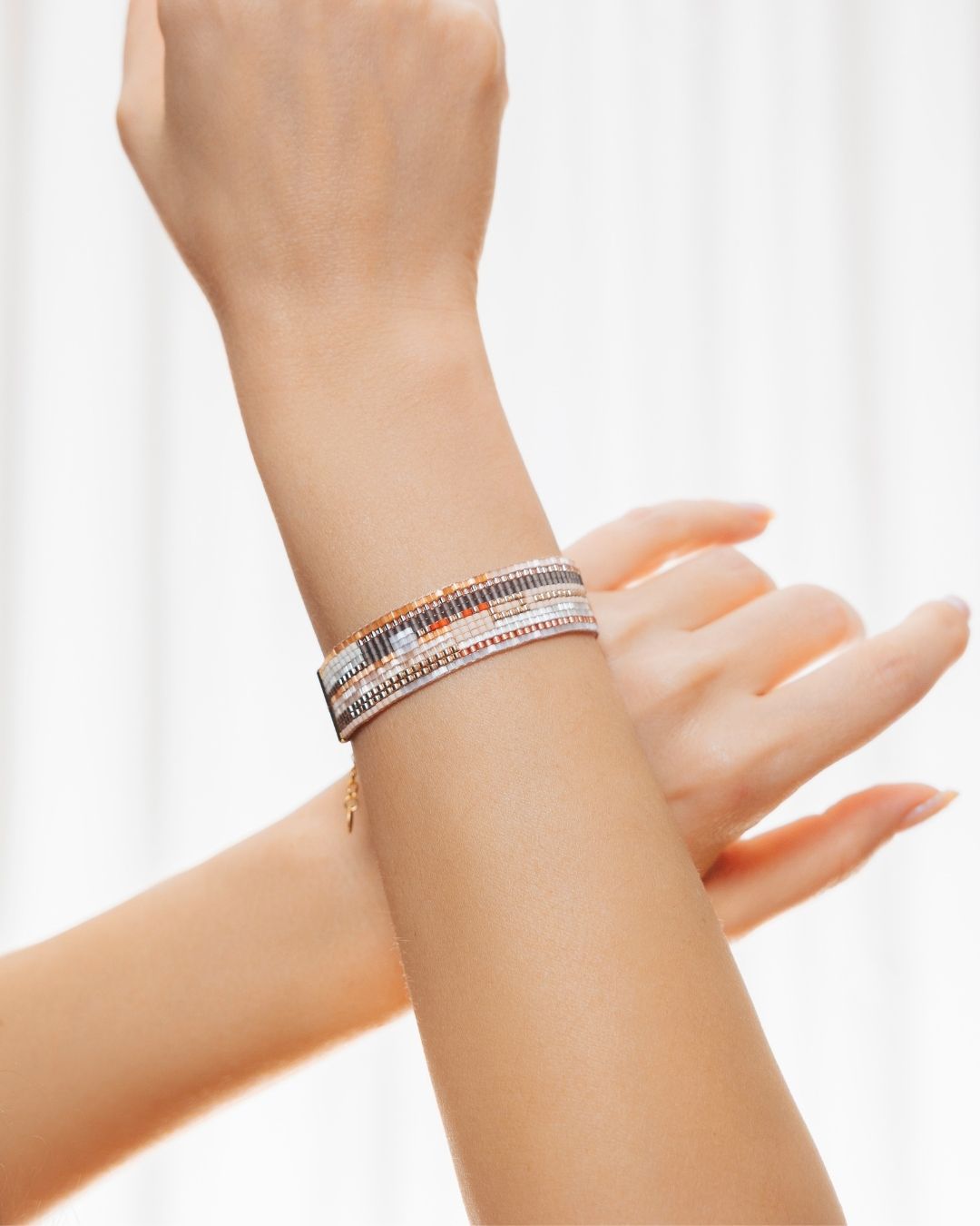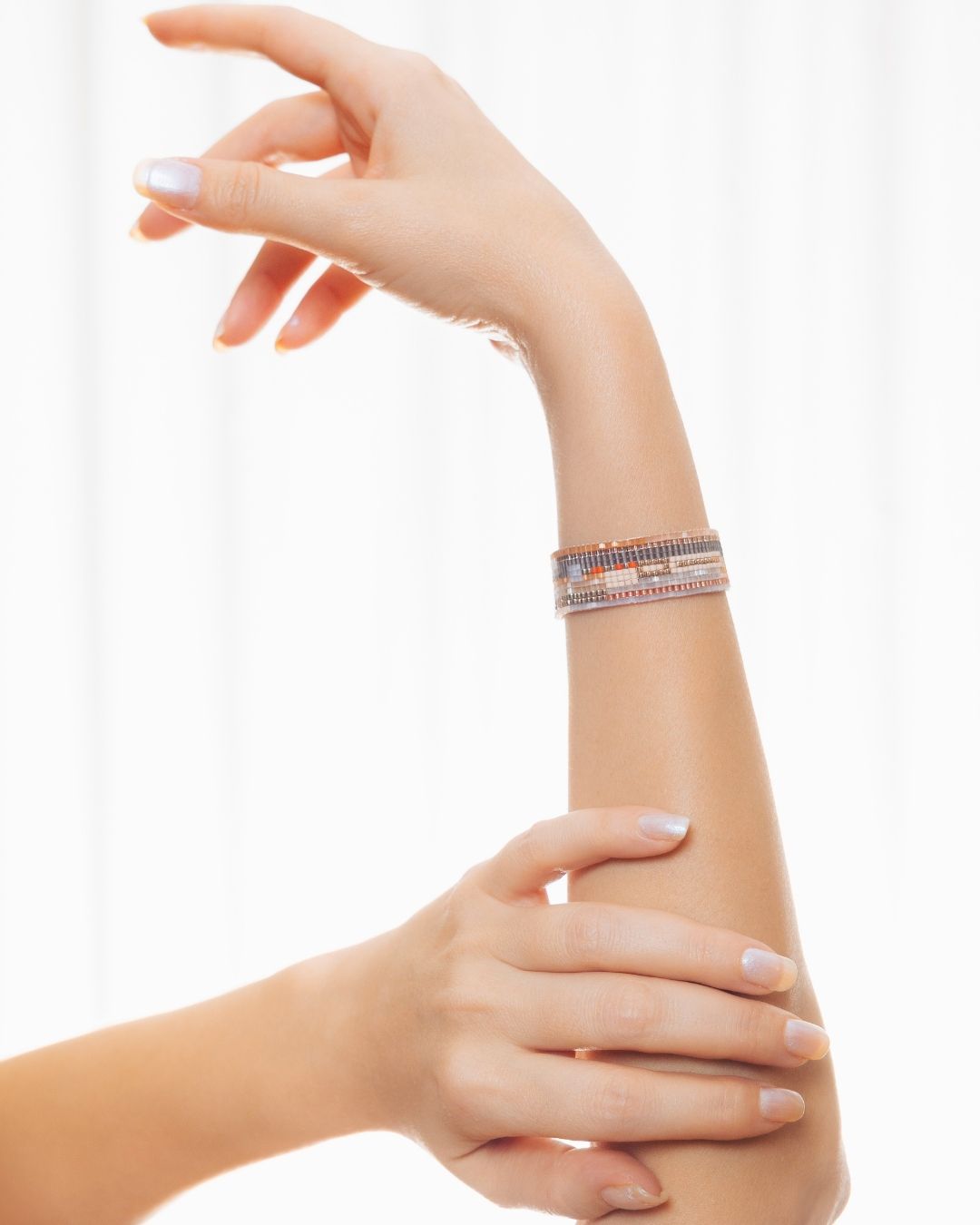 Hilma, Fransız tasarımcı Marion Mazô’nun tasarladığı, pastel tonların sıralı ve uyumlu çizgiler halinde birleşerek modern bir görünüm kazandığı özel bir bileklik.