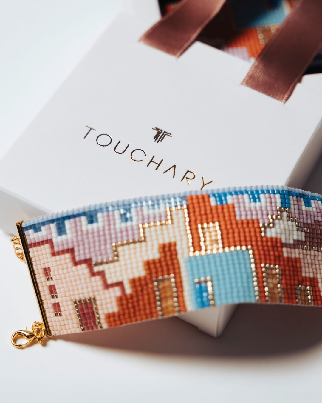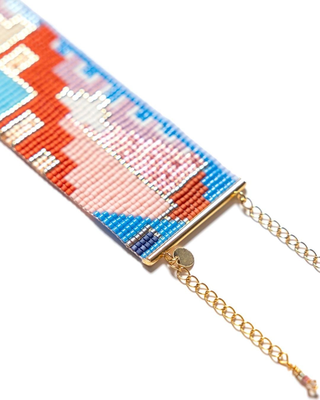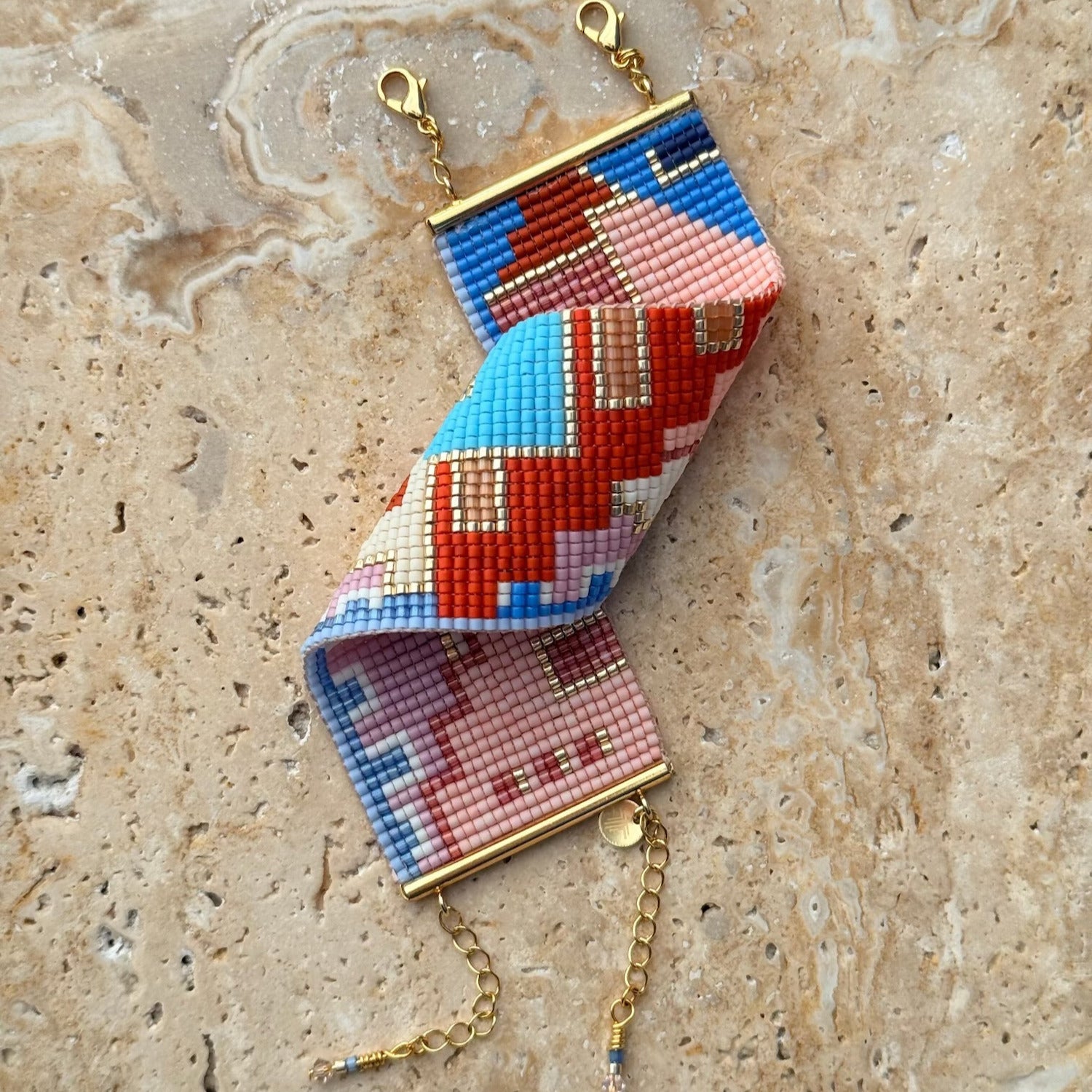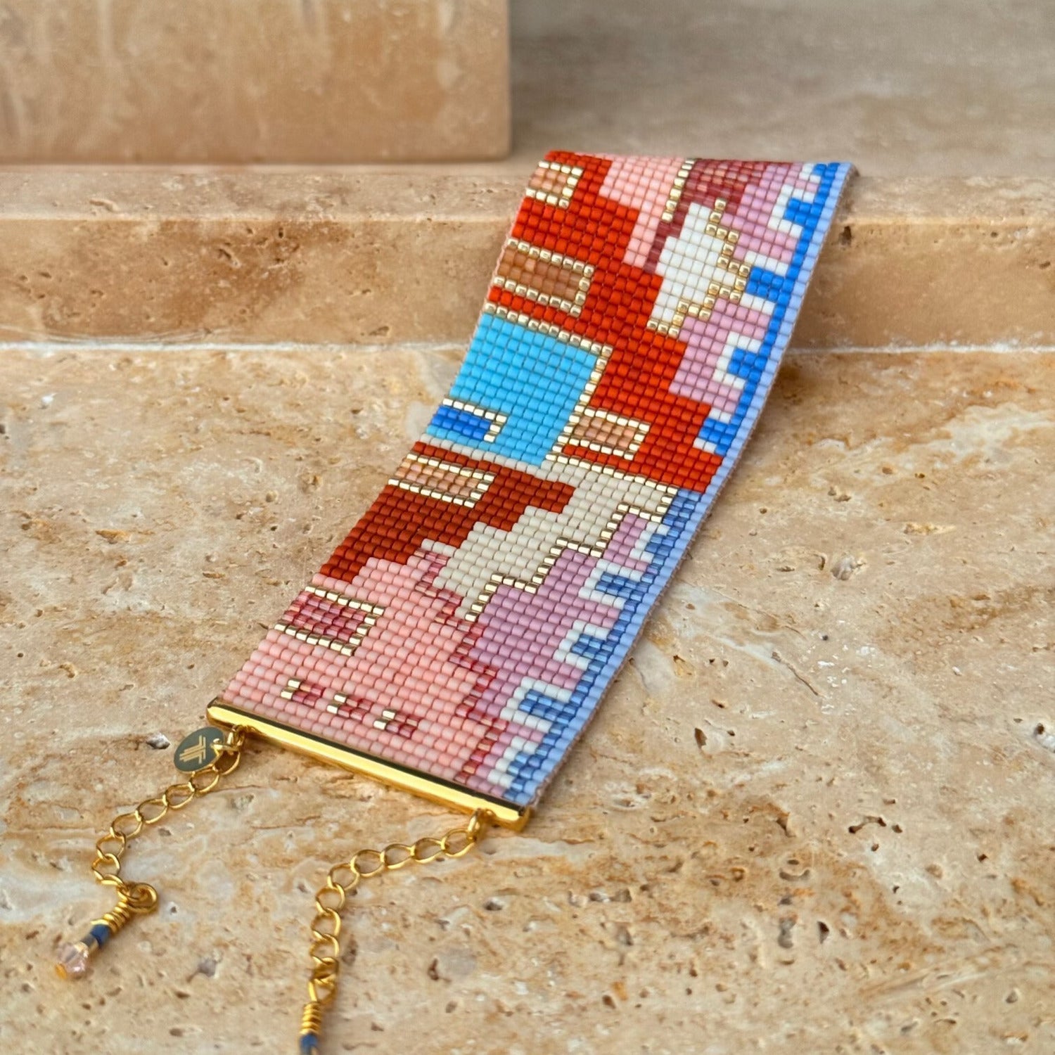 Her bir boncuk, Bofill’in mimarisindeki ritmi, dengeyi ve derinliği çağrıştıracak şekilde ilmek ilmek işlendi. 14K altın kaplama metal detaylar, tasarıma modern ve ışıltılı bir dokunuş katıyor.