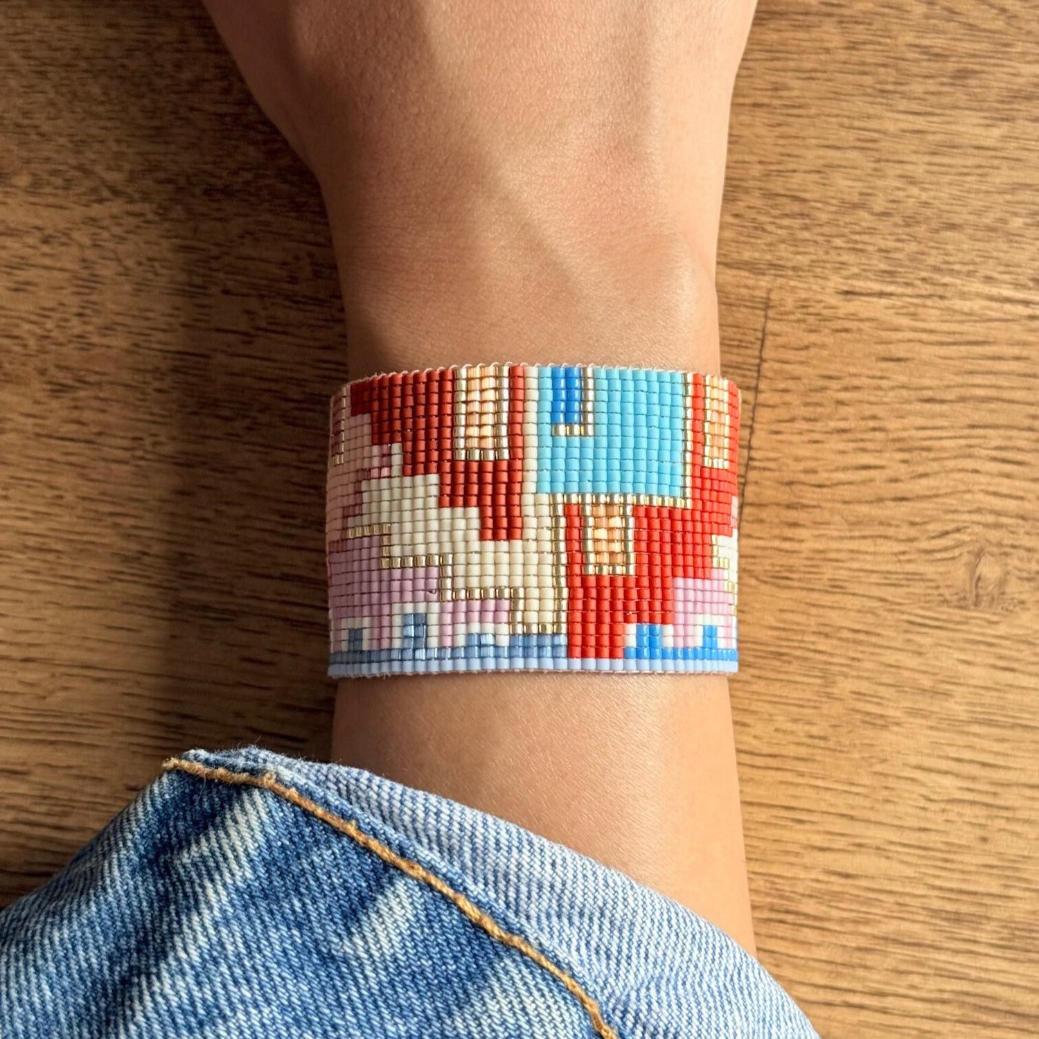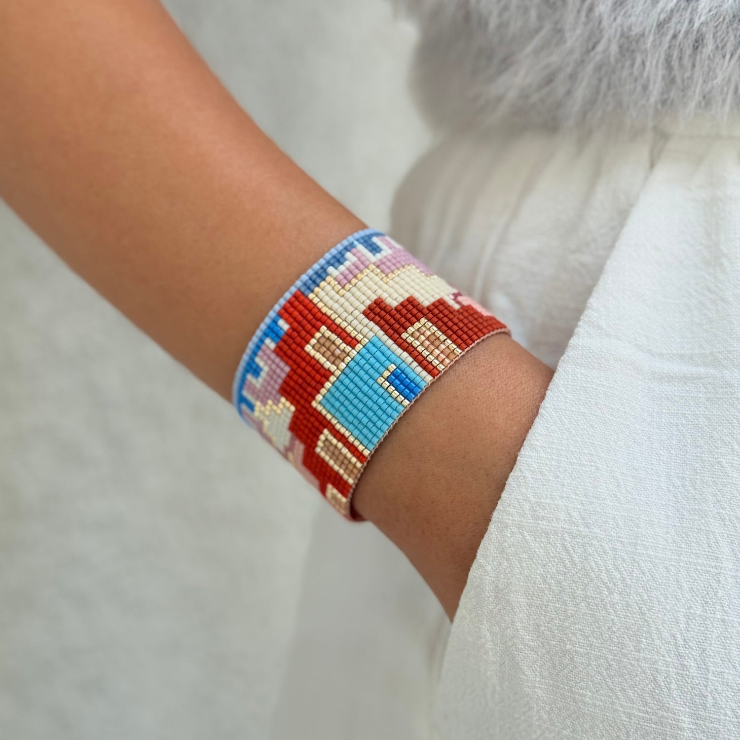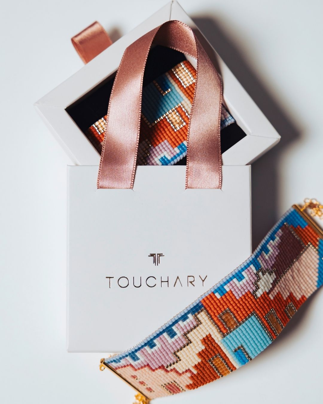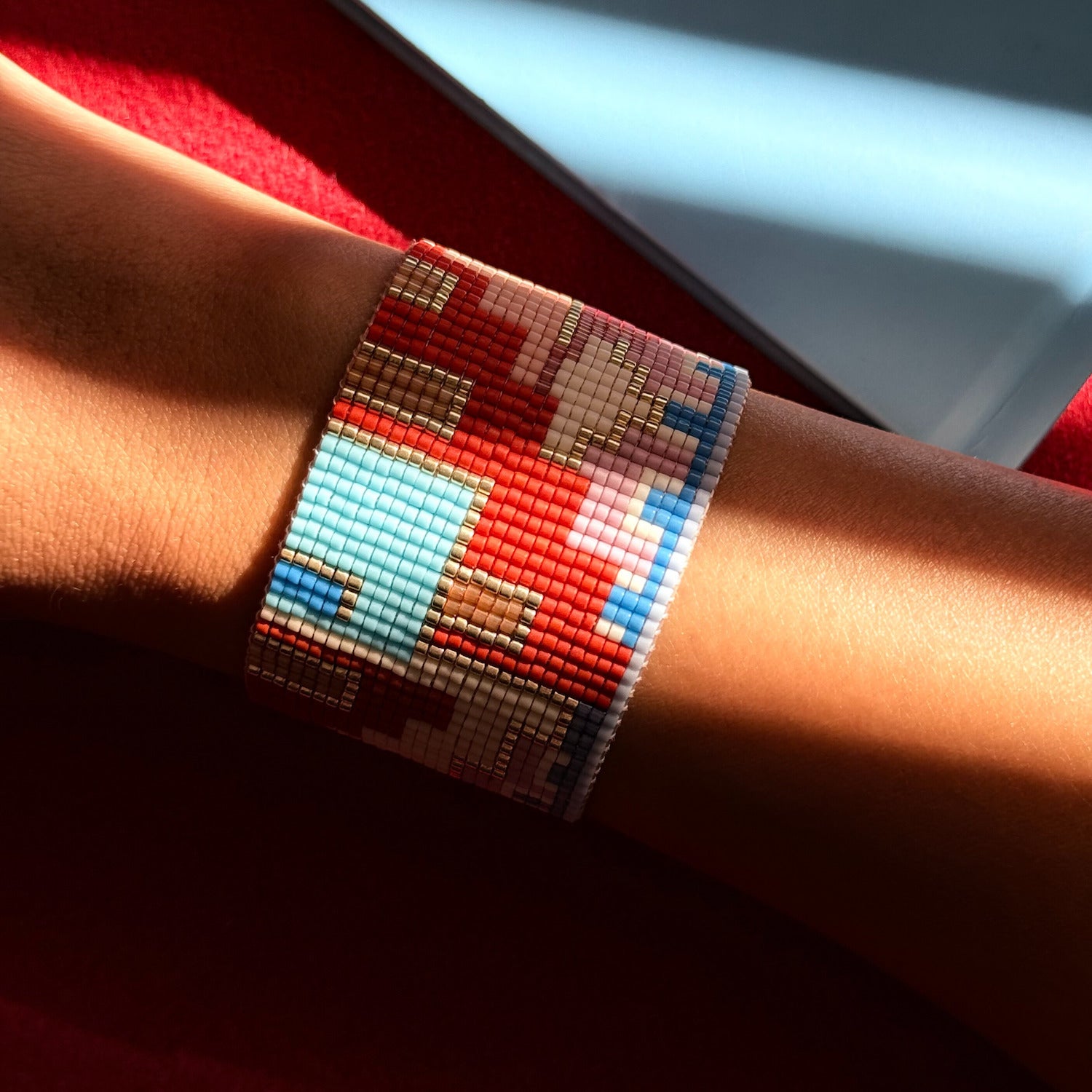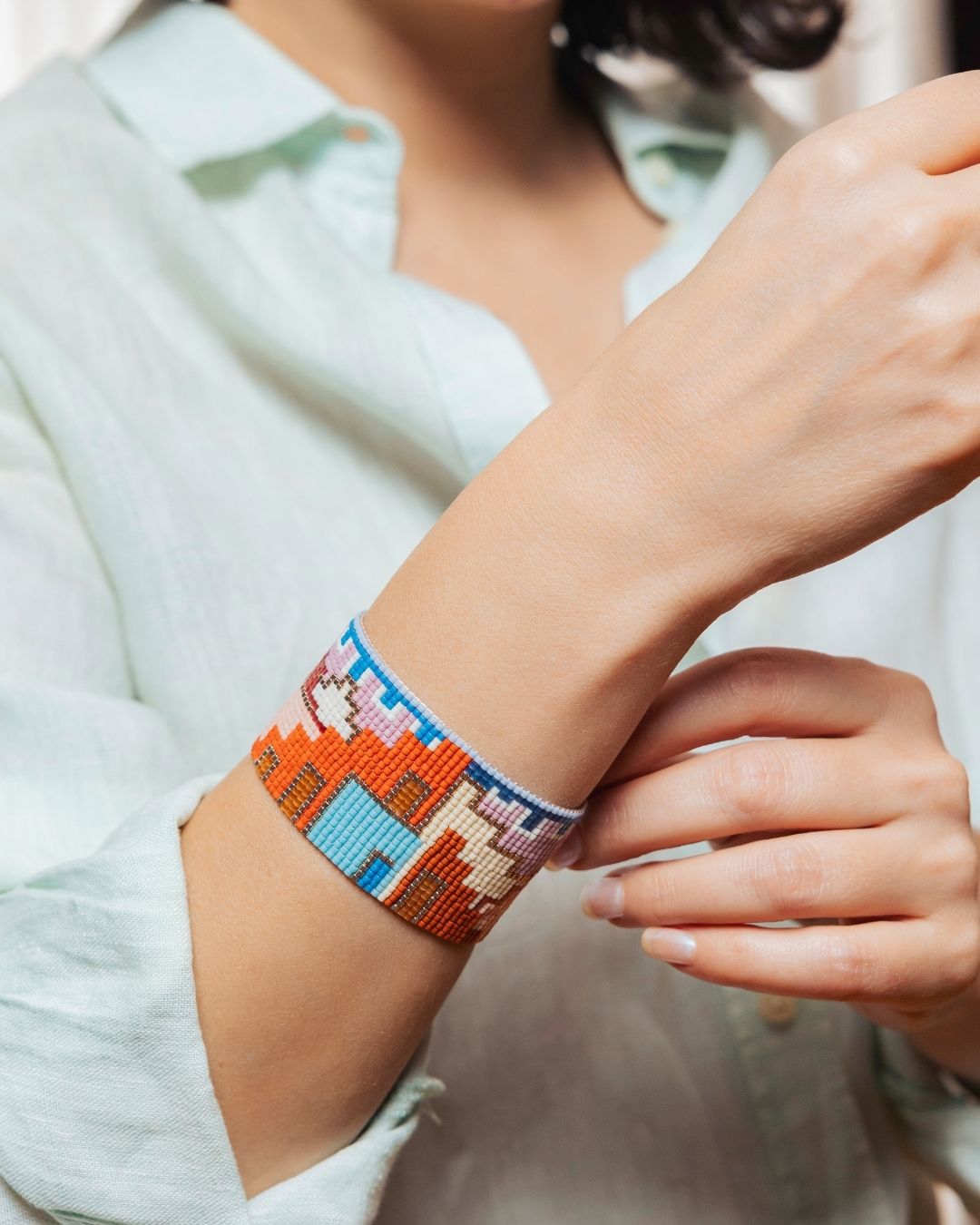 Her bir boncuk, Bofill’in mimarisindeki ritmi, dengeyi ve derinliği çağrıştıracak şekilde ilmek ilmek işlendi. 14K altın kaplama metal detaylar, tasarıma modern ve ışıltılı bir dokunuş katıyor.