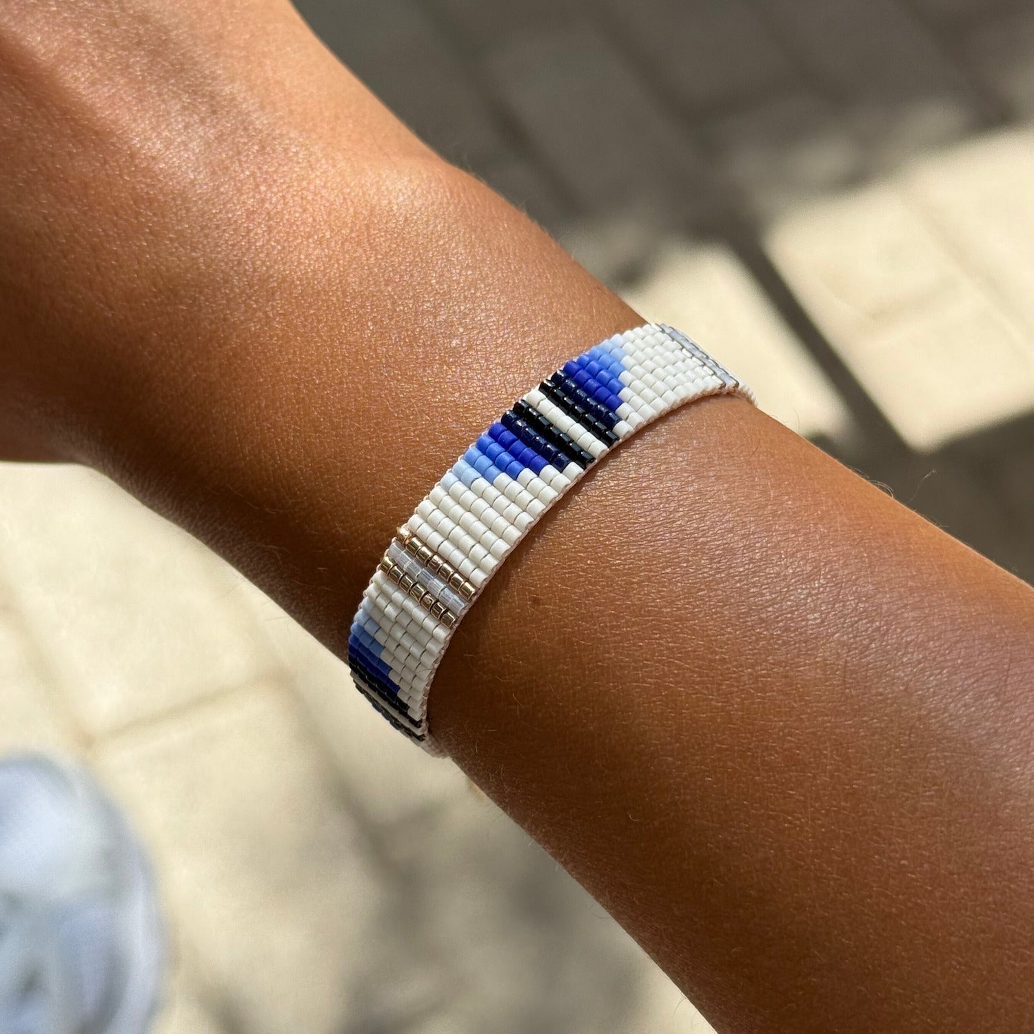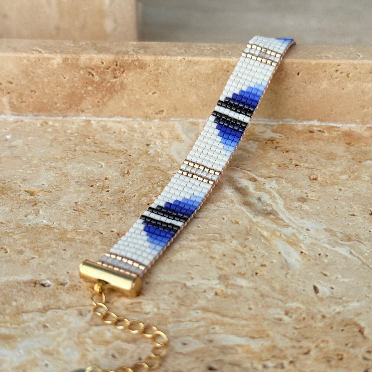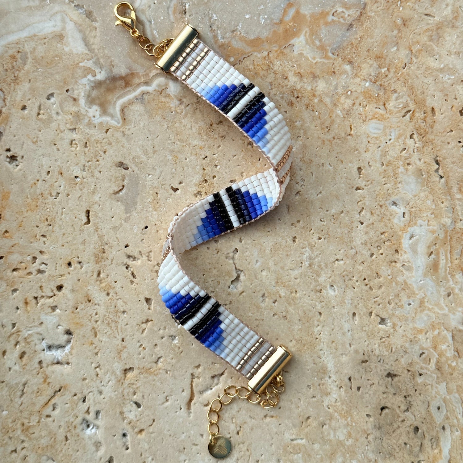 Stella, Fransız tasarımcı Marion Mazô’nun özgün deseniyle ortaya çıkan, açık ve koyu mavi tonların uyumunu taşıyan modern bir bileklik.