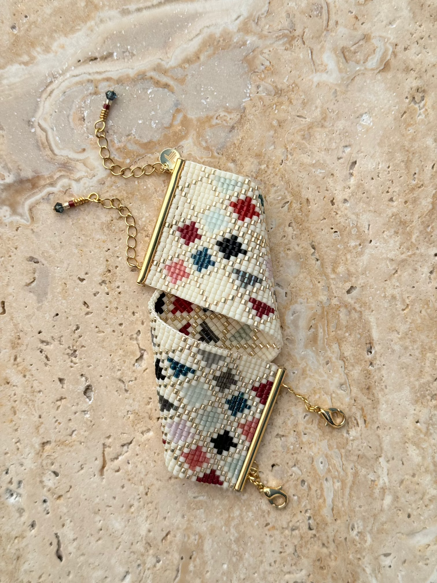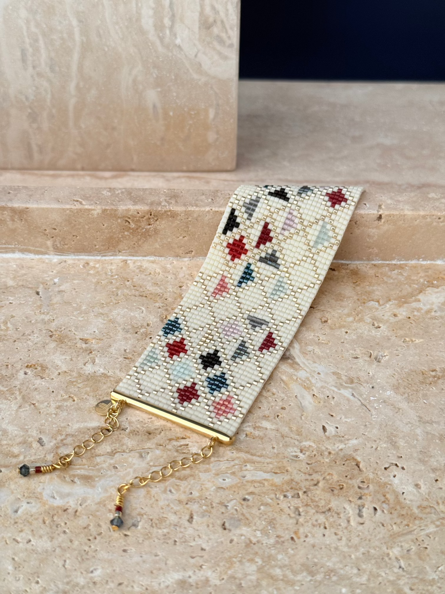 The pattern is 3.5 cm wide and the bracelet includes an adjustable chain (14 cm – 19 cm) for a comfortable fit.